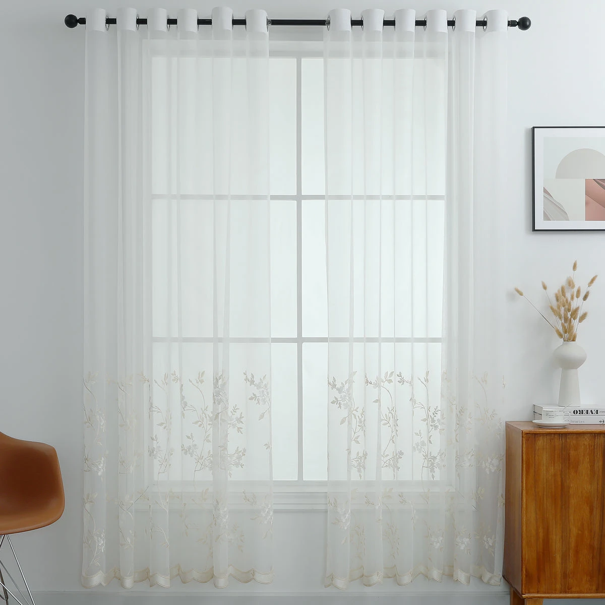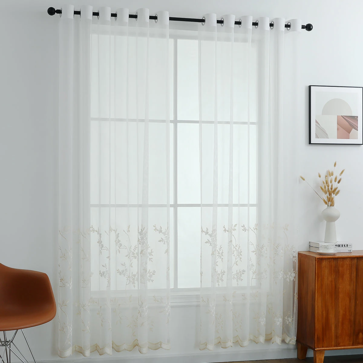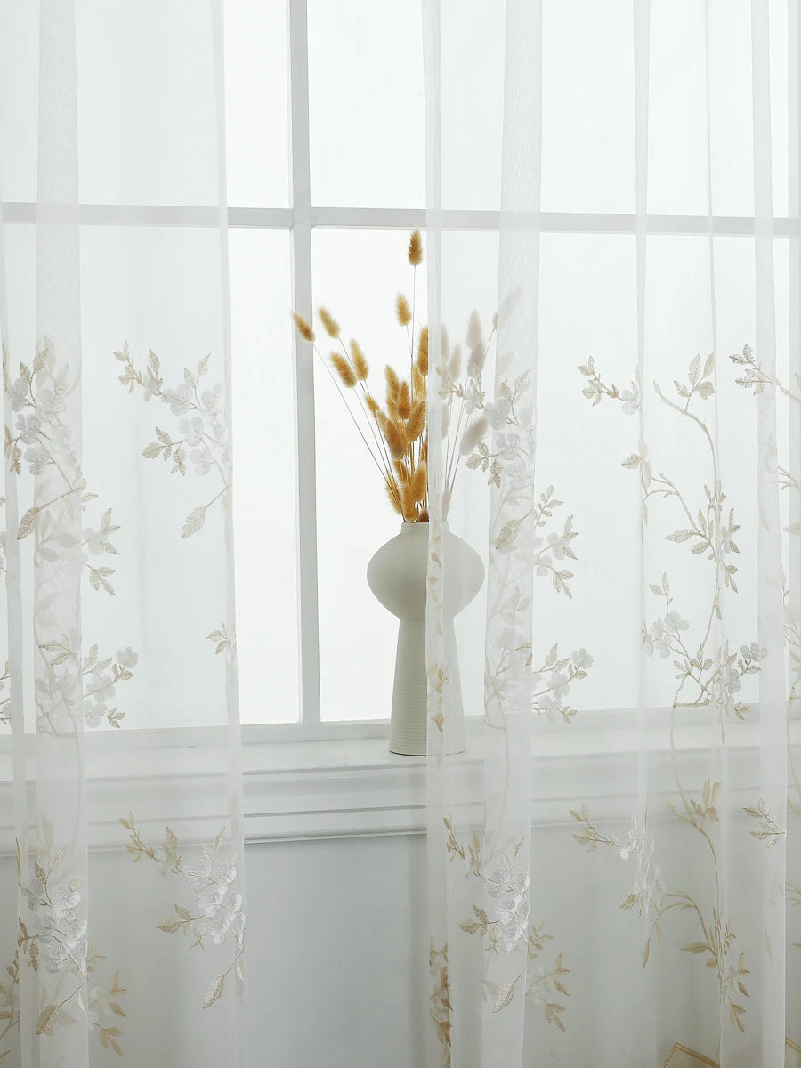 The sheer curtain features delicate floral embroideries, scalloped hem, adding a touch of elegancy to your room. Its sheer design lets in natural light, making it an ideal pick for any of your rooms. Easy installation with 12 grommet holes on the top. ​