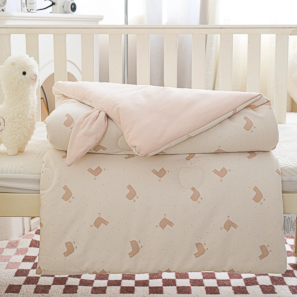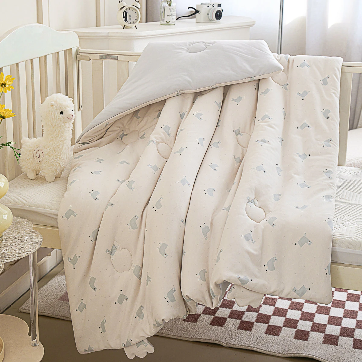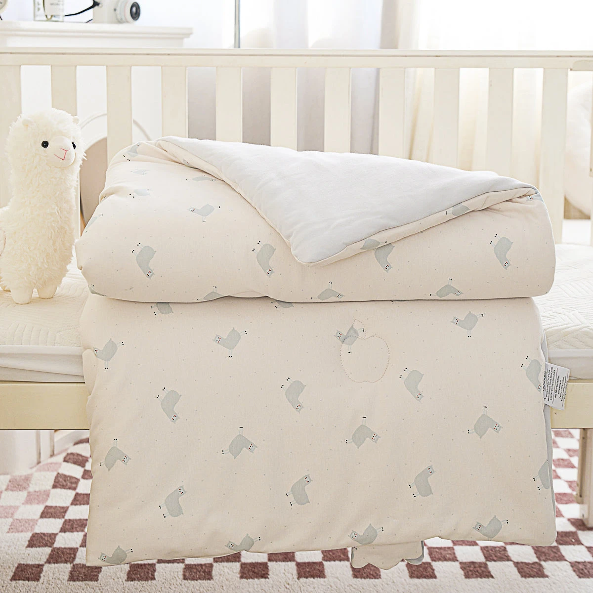 With its colorful alpaca patterns and breathable kitted cotton fabric, this baby all season comforter pairs adorable ear design with incredible softness that’s gentle on baby’s skin. It’s crafted from knitted cotton material that’s lightweight and durable.