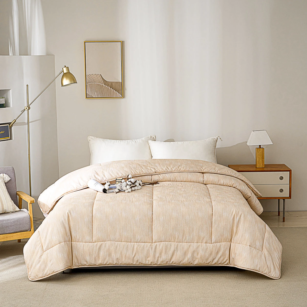 One for All Season: Thin microfiber fillings are made into a batt before attaching to the outer fabric, making the comforter drape around your body and less likely to move during the night.