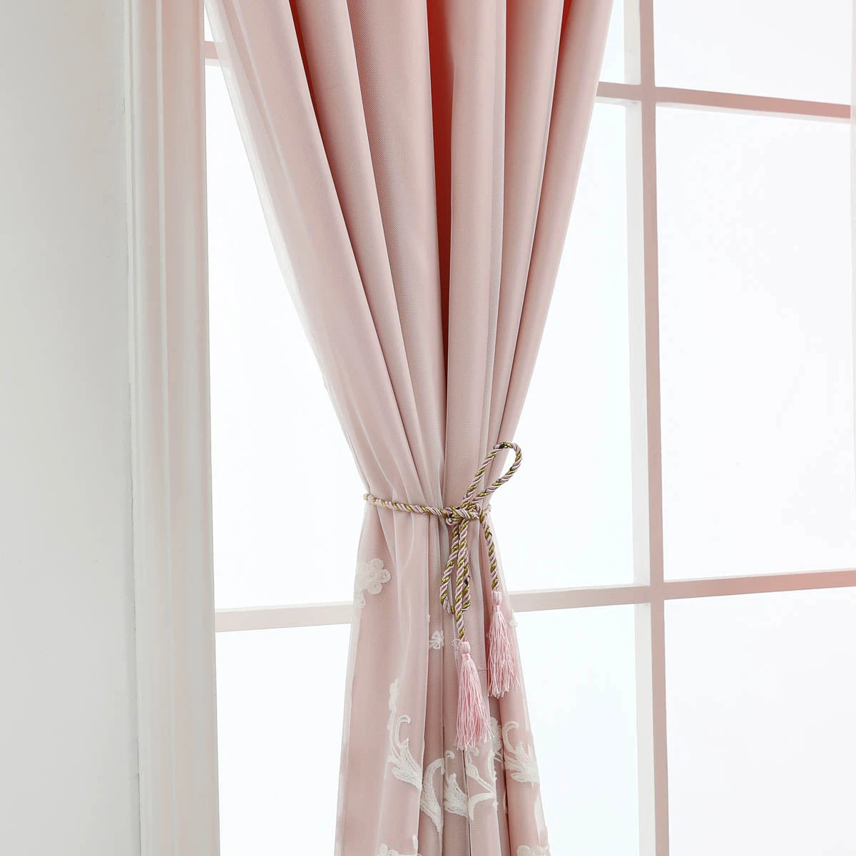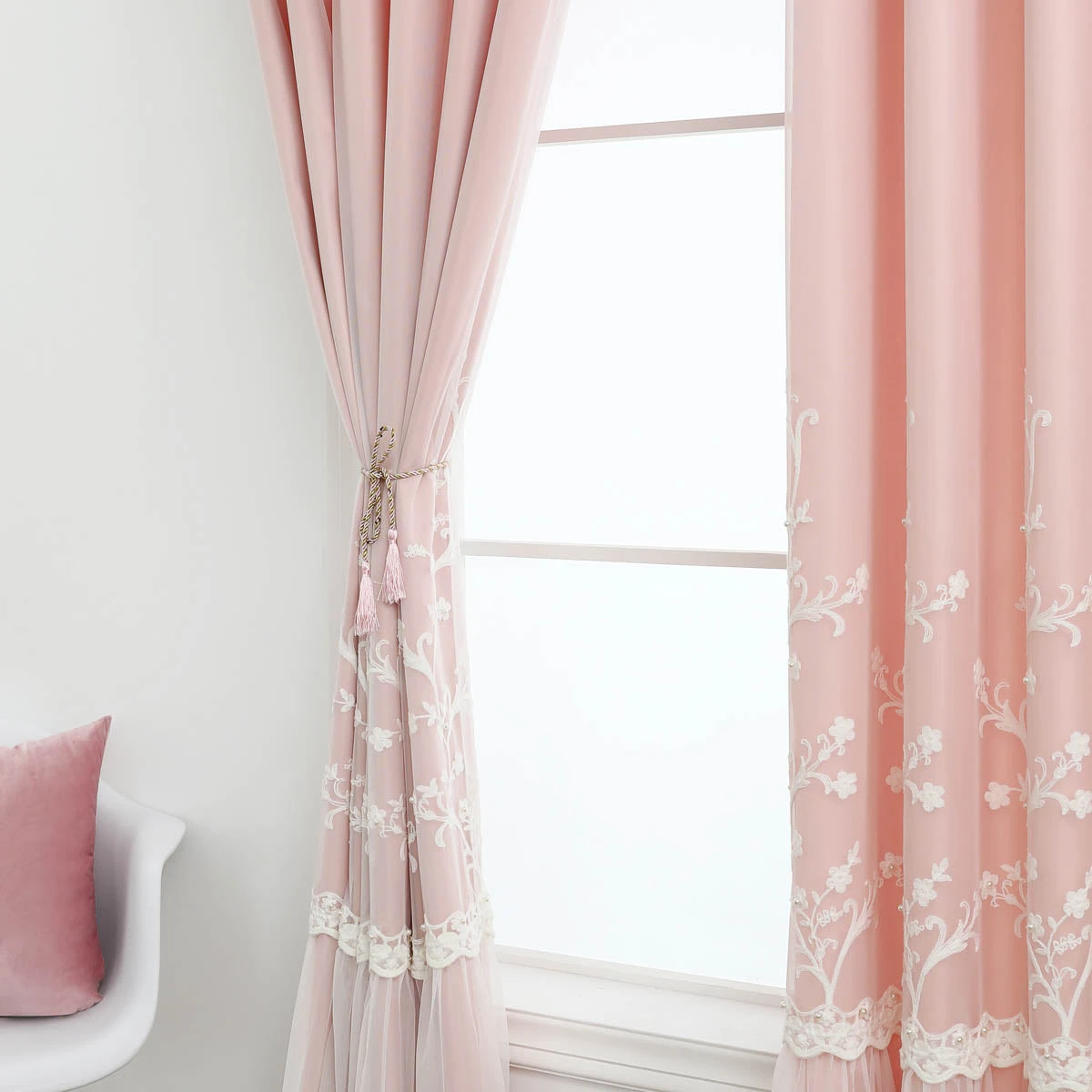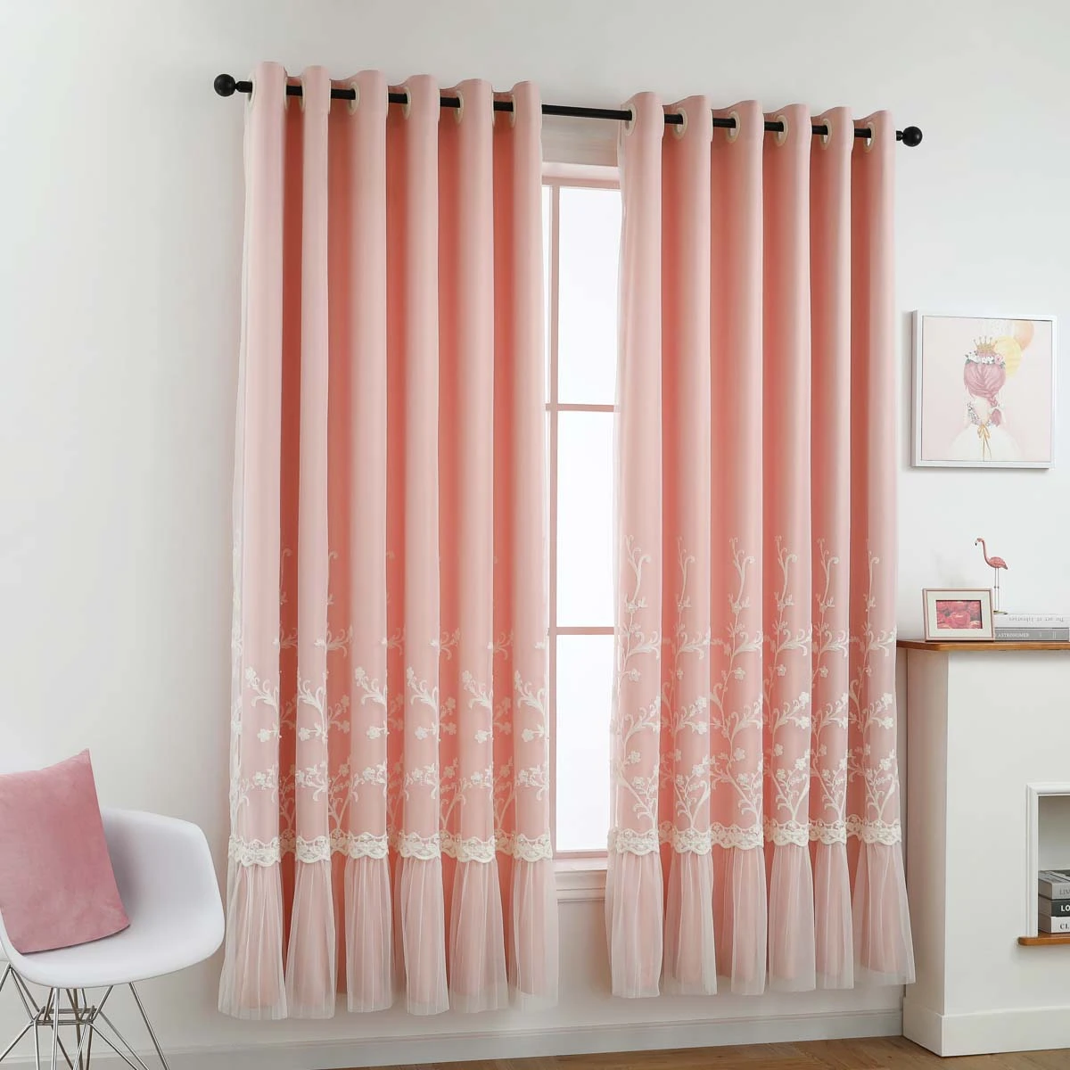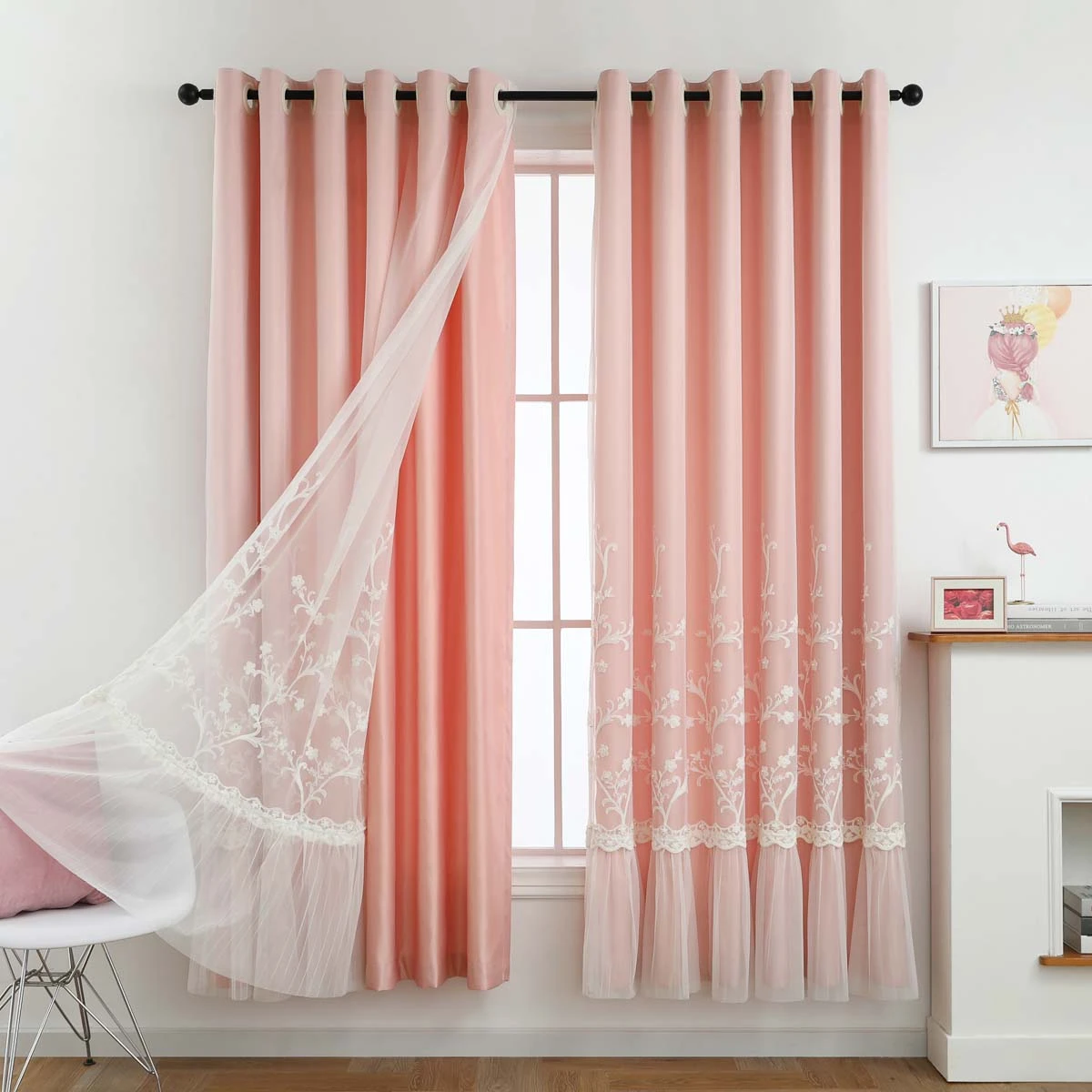 This double-layer curtain is a mix & match sheer lace and backdrop grommet curtains. The backdrop controls light and increases privacy. The sheer features tulle-like hem and embroidered lace that enhance your space with subtle texture and add an elegant touch. Made of easy to care for polyester.