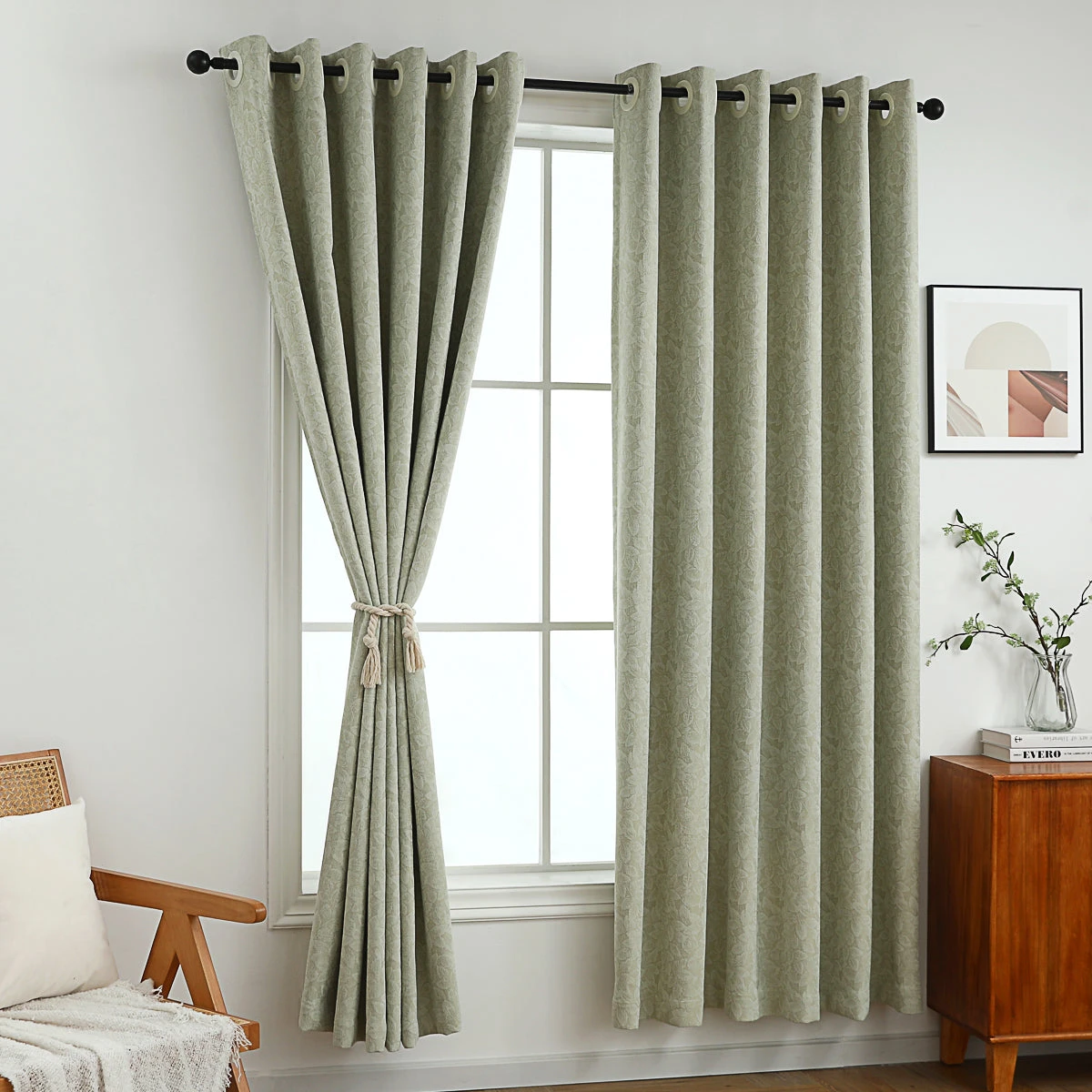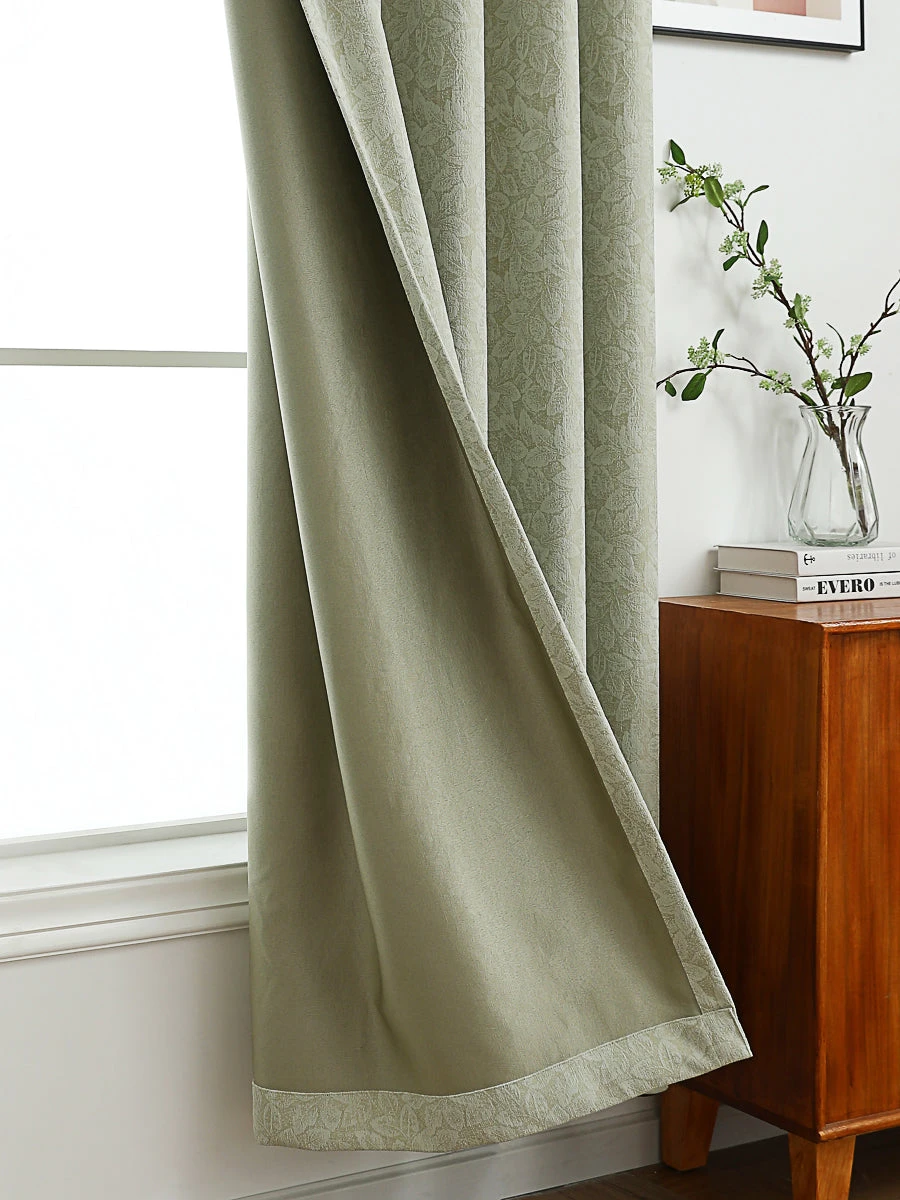 Our Whisper Leaves Jacquard Curtain is a blend of classic elegance and modern style. Featuring a soft green solid color background adorned with a subtle leaves print, this curtain adds a touch of nature-inspired charm to any room. It blocks out 85% of light, creating a perfect balance of privacy and natural illumination. Versatile and easy to pair with various décor styles, this curtain is an ideal choice for a serene and stylish space. The curtain is equipped with 8-12 metal grommets for quick and easy installation.
